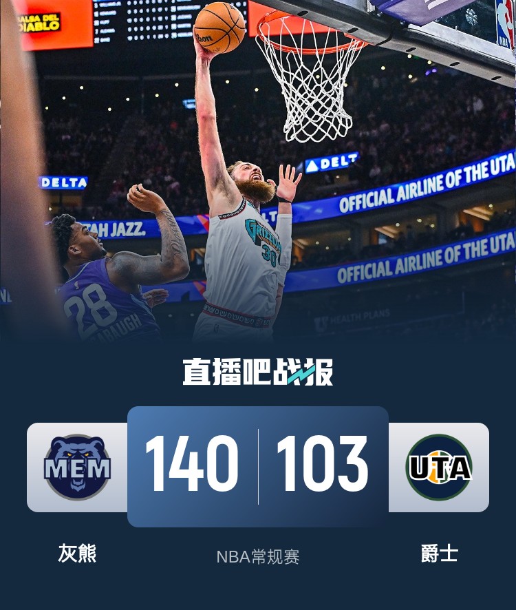 首节之争灰熊面对西部垫底的爵士却完全占不到便宜,相反节中爵士送上一波16-4的攻势拉开比分垫底首节领先;次节爵士仍然保持着高效攻势单节拿下30分,灰熊防不住对手一直被动追分,最后时刻他们依靠一波11-0的攻势才追至1分进入下半场。休息归来灰熊总算找回自己的节奏,他们开局不久连续命中4记三分送上24-10的攻势直接拉开两位数分差,后半段延续攻势势不可挡,这一节灰熊狂轰41分帮助他们取得23分领先早早奠定胜局。最终,灰熊客场轻取爵士完成赛季横扫。