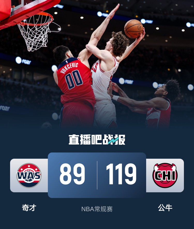 上半场,双方开场势均力敌,比分咬得很紧,次节奇才命中率下降,公牛火力全开,里突外投不断扩大优势,奇才冲击篮筐苦苦追赶,半场战罢公牛58-43领先奇才。下半场,公牛牢牢占据场上主动,轻松将分差拉开到20分以上,末节奇才仍无起色,公牛越战越勇将优势扩大到30分以上。最终,公牛119-89大胜奇才,送给对手5连败。