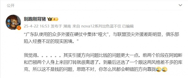 媒体人@别跑刚背猪 在社媒上谈到了这篇文章,他在个人微博上写道:“我觉得。。。。。。其实引援方向问题比钱的问题更大一点。前两个阶段在阿姆斯和巴顿两个人身上来回打转就很离谱了。到最后还选了一个跟这两差不多的库克。”
