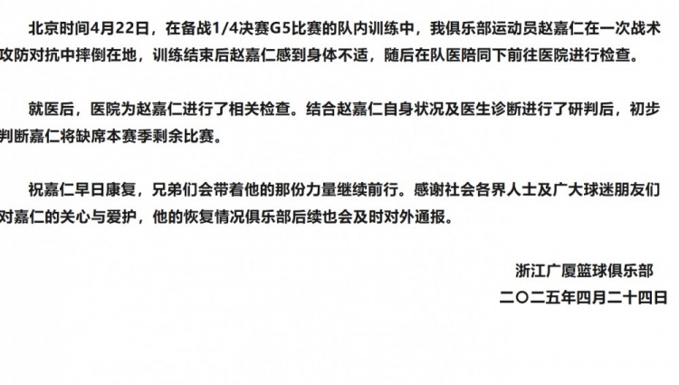 4月24日讯 今天,广厦男篮官方更新了赵嘉仁的伤情,详情如下: