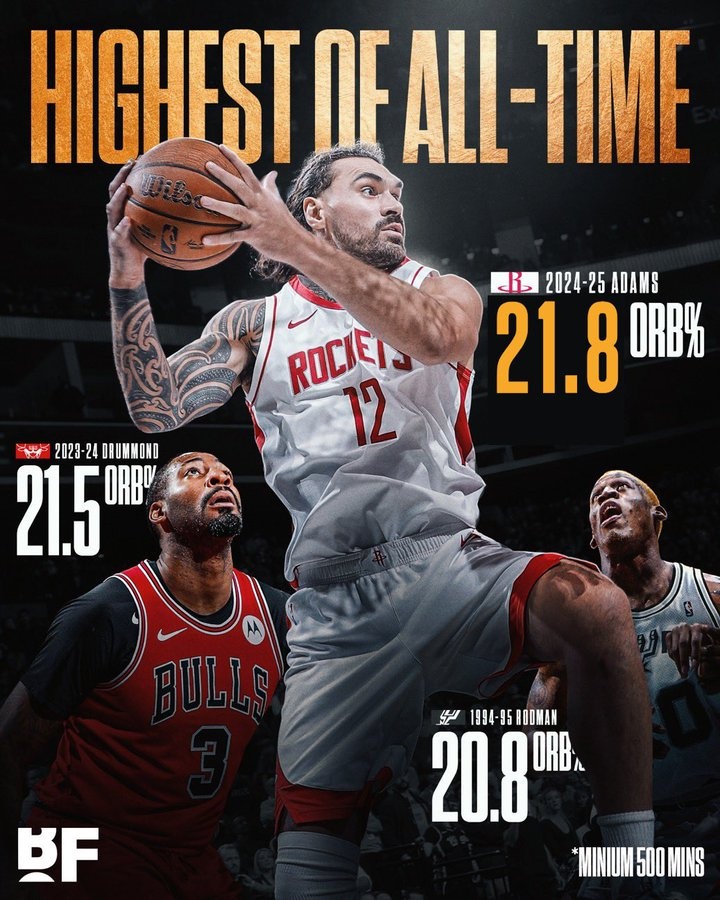 这个赛季,亚当斯的进攻篮板率高达21.8%,超越罗德曼(1994-95赛季,20.8%)和德拉蒙德(2023-24赛季,21.5%),创NBA历史纪录(单赛季至少出战500分钟)。