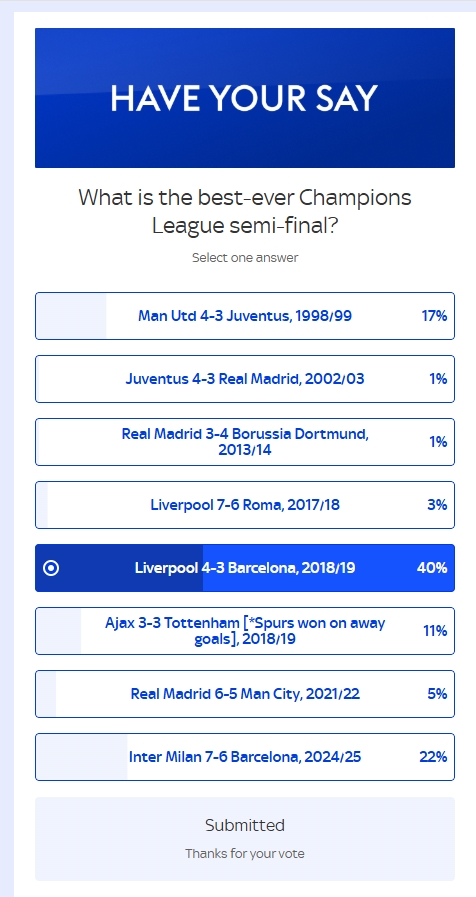 天空体育借此机会,做出一个投票:有史以来最精彩的欧冠半决赛是哪一场?(注:天空图中皇马3-4多特的赛季有误)