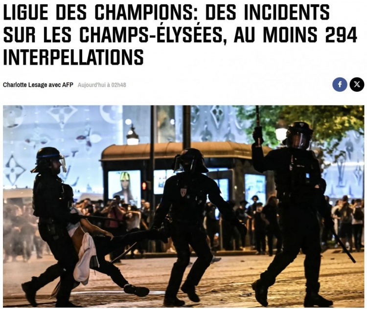 6月1日讯 在巴黎圣日耳曼夺得欧冠冠军后,巴黎球迷们庆祝时有一些过激行为,法国媒体RMC透露目前警方已经逮捕了至少294人。