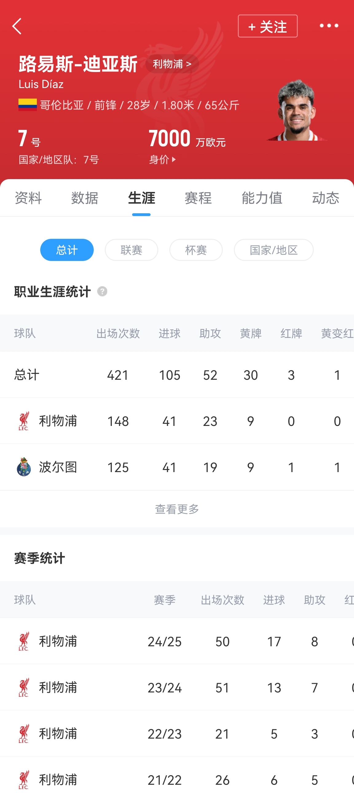 迪亚斯2022年冬窗5400万欧元从波尔图转会利物浦,目前共为利物浦出场148次,打入41球23助攻,他的身价从加盟前的4000万欧元涨至目前的7000万欧元。