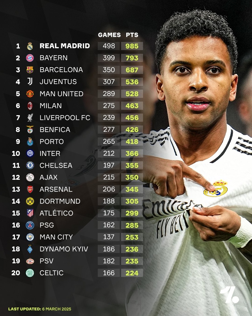 欧冠历史积分榜:皇马985分断档领先,拜仁793分第2 巴萨687分第3