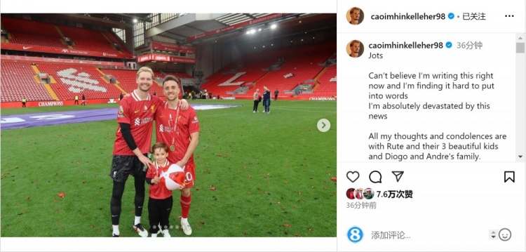7月4日讯 利物浦前锋若塔因车祸离世,前队友凯莱赫社媒发文悼念。凯莱赫社媒晒出与若塔的合照,并写道:“真的不敢相信我现在正在写这些话...