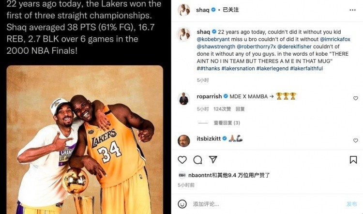 3年前的今天,奥尼尔在个人社媒晒出二人夺冠合照,并写道:“22年前的今天,要是没有你@科比,我做不到(夺冠),要是没有你们@里克-福克斯@布莱恩-肖@罗伯特-霍里@费舍尔,我也做不到。要是没有你们中任何一人我都做不到。正如科比所说‘团队(TEAM)里没有我(I)这个字母,但是有ME(我)啊。”