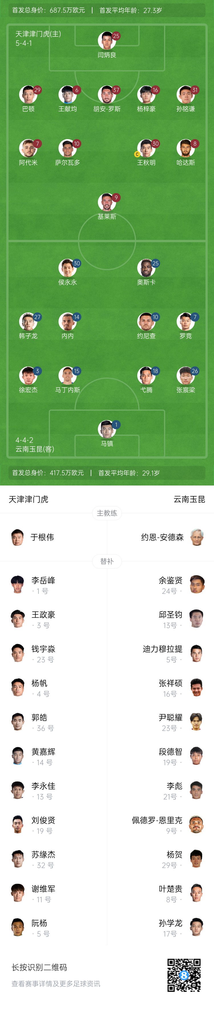 05月11日讯 北京时间19点,中超第12轮,津门虎主场迎战云南玉昆,赛前双方公布首发。