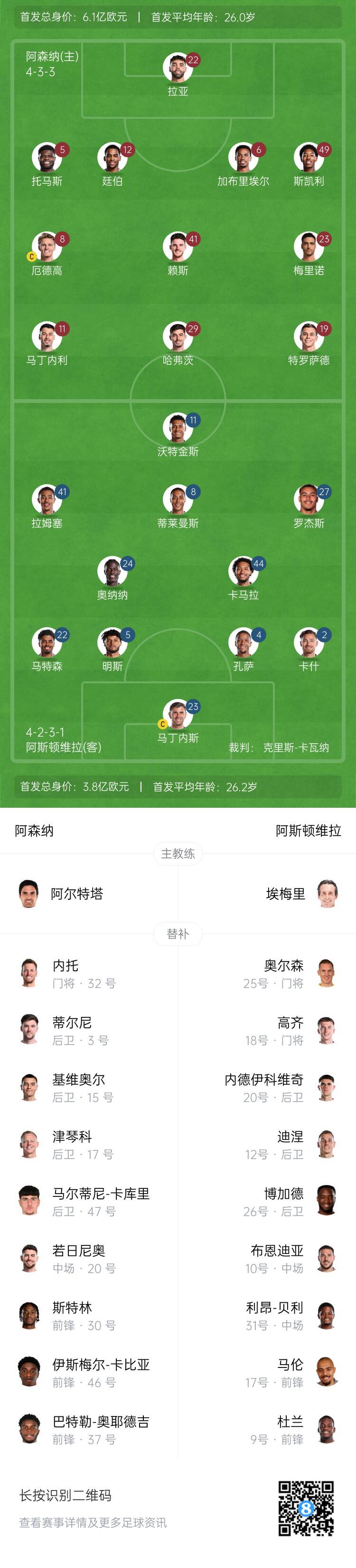 阿森纳替补:32-内托、3-蒂尔尼、15-基维奥尔、17-津琴科、20-若日尼奥、30-斯特林、37-奥耶德吉、46-卡比亚、47-卡库里